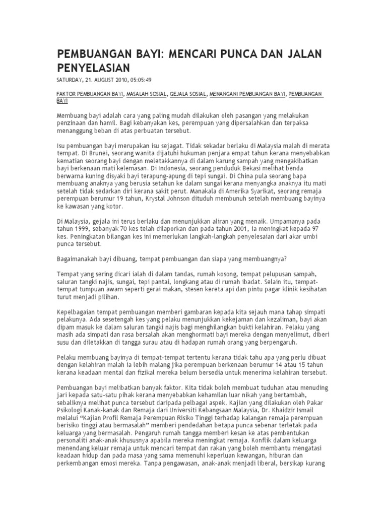 Waima, dibunuh atau ditinggalkan hidup, moralnya. Isu pembuangan bayi merupakan isu sejagat.tidak sekadar berlaku di malaysia malah di merata tempat. Kes pembuangan bayi dalam kalangan remaja. Karangan bahasa malaysia (bm) stpm : Kasus semacam ini punya dimensi penyebab yang berlapis.