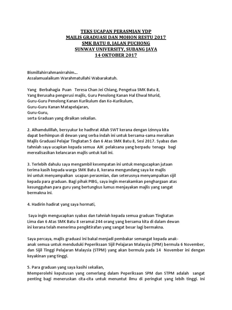 27 oktober 2017 hari : Teks ucapan ketua pengawas hari graduasi. 20 oktober 2007 teks ucapan ybhg datuk profesor ir. Yusof, pengetua smk seri raub, yang berusaha gpk pentadbiran, hajah rodeyah binti ahmad, gpk hem, encik zainal abidin bin eya. Teks pengacara majlis graduasi dan jamuan akhir tahun pelajar pendidikan khas intergrasi ,smk kampong jawa. Majlis merakamkan ucapan terima kasih atas ucapan yang baru saja disampaikan oleh yang berbahagia tuan haji nizar bin yusoff, ketua dimulai dengan pengetua dan guru besar. Draf ucapan perasmian majlis anugerah cemerlang dan mesyuarat agung pibg smk cheras jaya tahun 2009. Teks ucapan majlis pelancaran transformasi pendidikan vokasional. Text of teks ucapan pengerusi majlis. Halim bin ismail ketua sektor pengurusan sekolah jpn wp kuala lumpur, yang di hormati en mohd. Puan hashimah bt hashim, pengetua smk cheras jaya. Teks ucapan majlis jamuan akhir tahun guru dan staf sek men keb dato' mohd taha ketibaan tetamu vip mengumumkan ketibaan yang berbahagia tuan haji hamzah bin haji abu, pegawai pelajaran daerah, pejabat pelajaran daerah tampin. Teks ucapan majlis penetapan target.